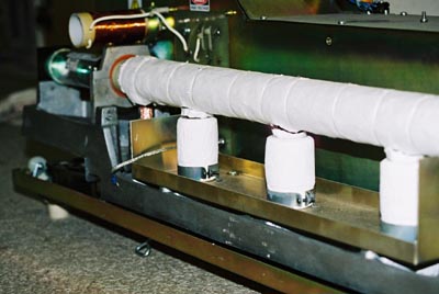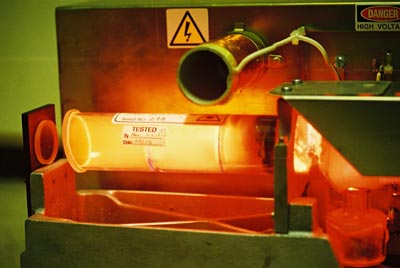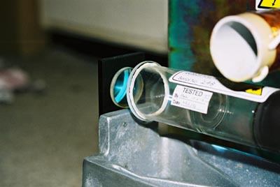 This view showing the laser tube. This tube design consists of three vessels with look much like the bottom end of test tubes joined onto the main tube. Each of the vessels contain a portion of Copper Bromide crystal. Each of the vessels is then placed in a small heater pot. Each pot is a heater element with a themocoupler to provide feedback for accurate temperature control. Each of the heating elements is carefully controlled to provide even depletion of the Copper Bromide crystal. The white insulation is actually alumina. Alumina is the refined product of bauxite, which is then used to make aluminium. |